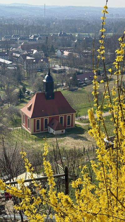 18.03.2026 Blick vom Weinbergsweg in Dresden Pillnitz auf Weinbergskirche und Schloss